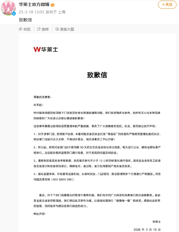 19 03-20 22:28华莱士被曝食品安全问题,官方回应:涉事门店永久关停,开除涉事员工